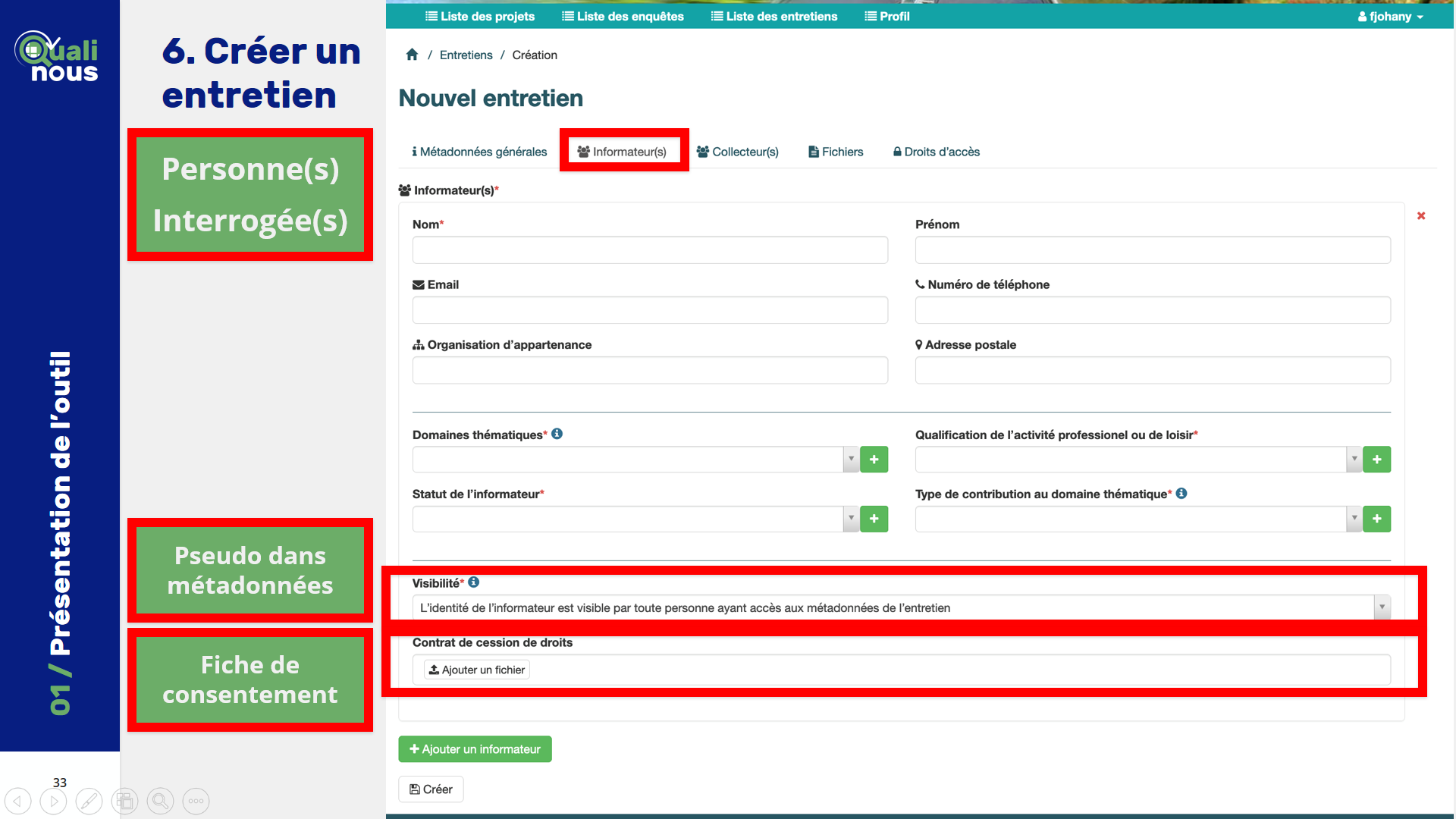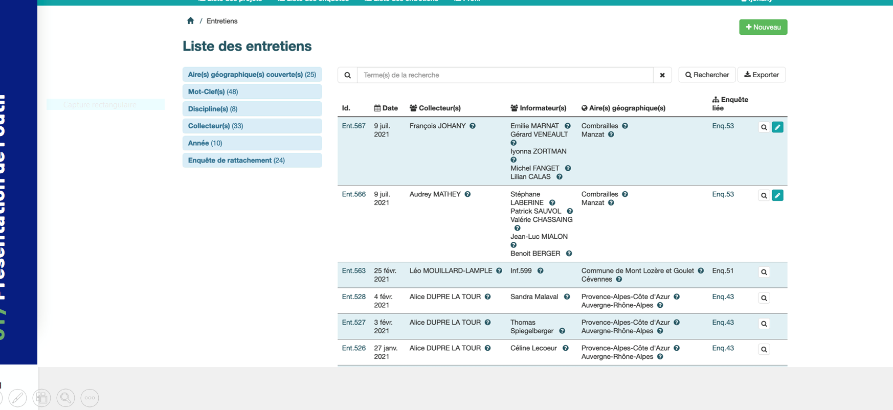 Publication de métadonnées dans Recherche.Data.GouvExporter la liste de ses entretiens ou de l’URRappel pour suppression des données (RGPD)ASPAR (Gestion des contacts)cartographique des localisations des entretiensConteneur principal de toutes les informationsintermédiaireéquipe "Enquête" collaborative| Entretien | Informateur | Collecteur |